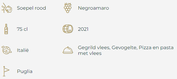 Werken op het ritme van de natuur en met respect voor het land. Enkel hand geplukte druiven van de allerbeste kwaliteit worden gebruikt. Oude wijnstokken en de beste terroirs van Puglia. Dit zijn zuiderse wijnen die de zon in je glas doen schijnen!
